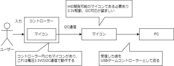 だからコントローラーのI2Cの信号を受け取って、その値をUSBゲームコントローラーとしてパソコンに送ってやるようなハードウェアを作れば良いのだ。